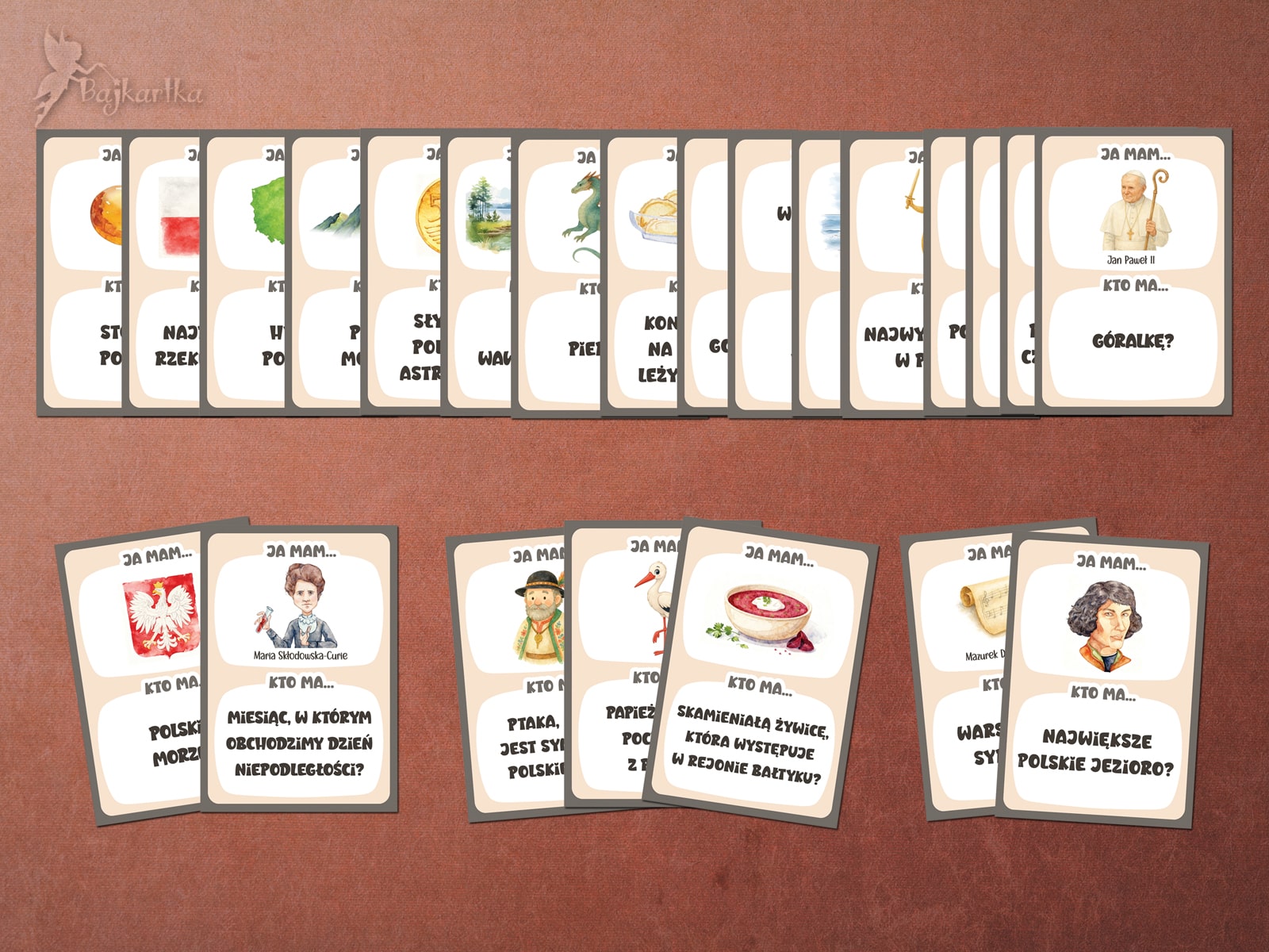 Każde dziecko otrzymuje jedną lub kilka kart. Na każdej znajduje się odpowiedź („Ja mam…”) oraz pytanie („Kto ma…?”) dotyczące Polski – jej symboli, przyrody, znanych postaci, potraw i miejsc.