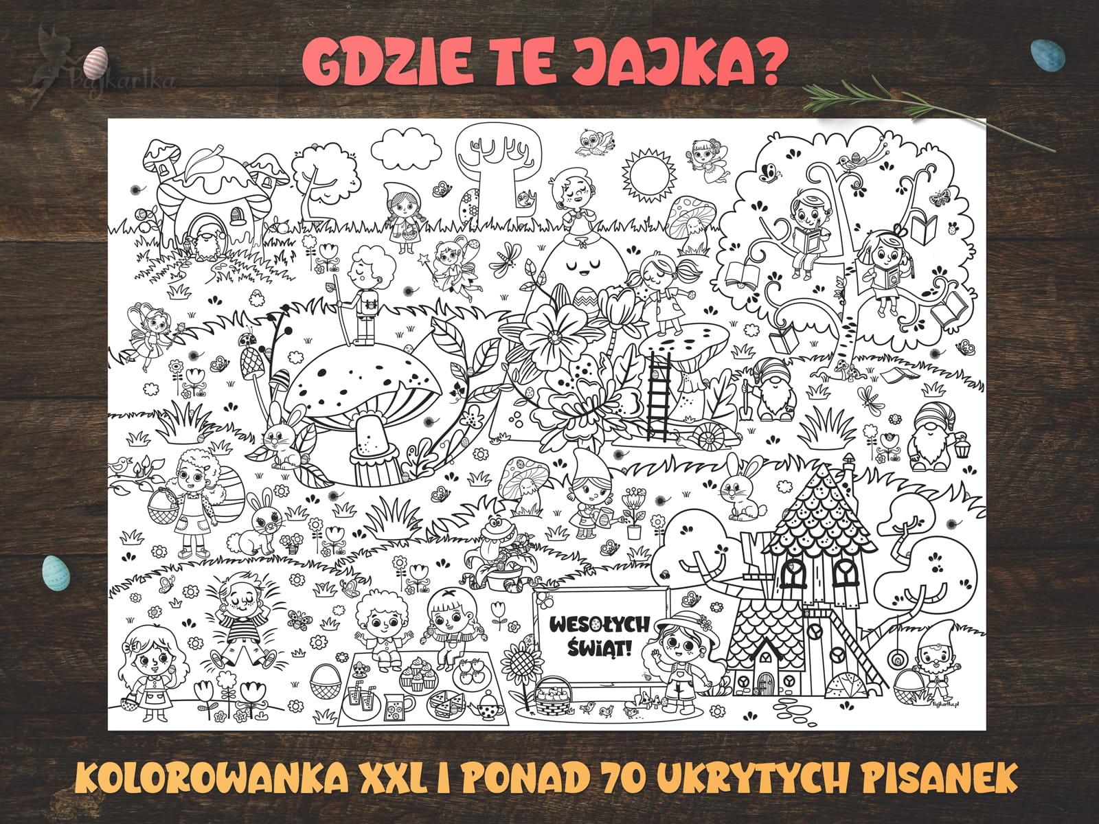 Jedną z ulubionych wielkanocnych zabaw dziecięcych jest szukanie jajek. Nic więc dziwnego, że wróżki, elfy, skrzaty i gnomy również postanowiły się pobawić i sprawiły najmłodszym wielką niespodziankę – wraz z Zajączkiem pochowały w zakamarkach Zaczarowanej Krainy ponad 70 pisanek. Zadaniem najmłodszych jest pokolorowanie obrazka i odnalezienie wszystkich ukrytych jaj. Niektóre z nich są duże i można je znaleźć od razu, ale inne mogą stanowić nie lada wyzwanie.