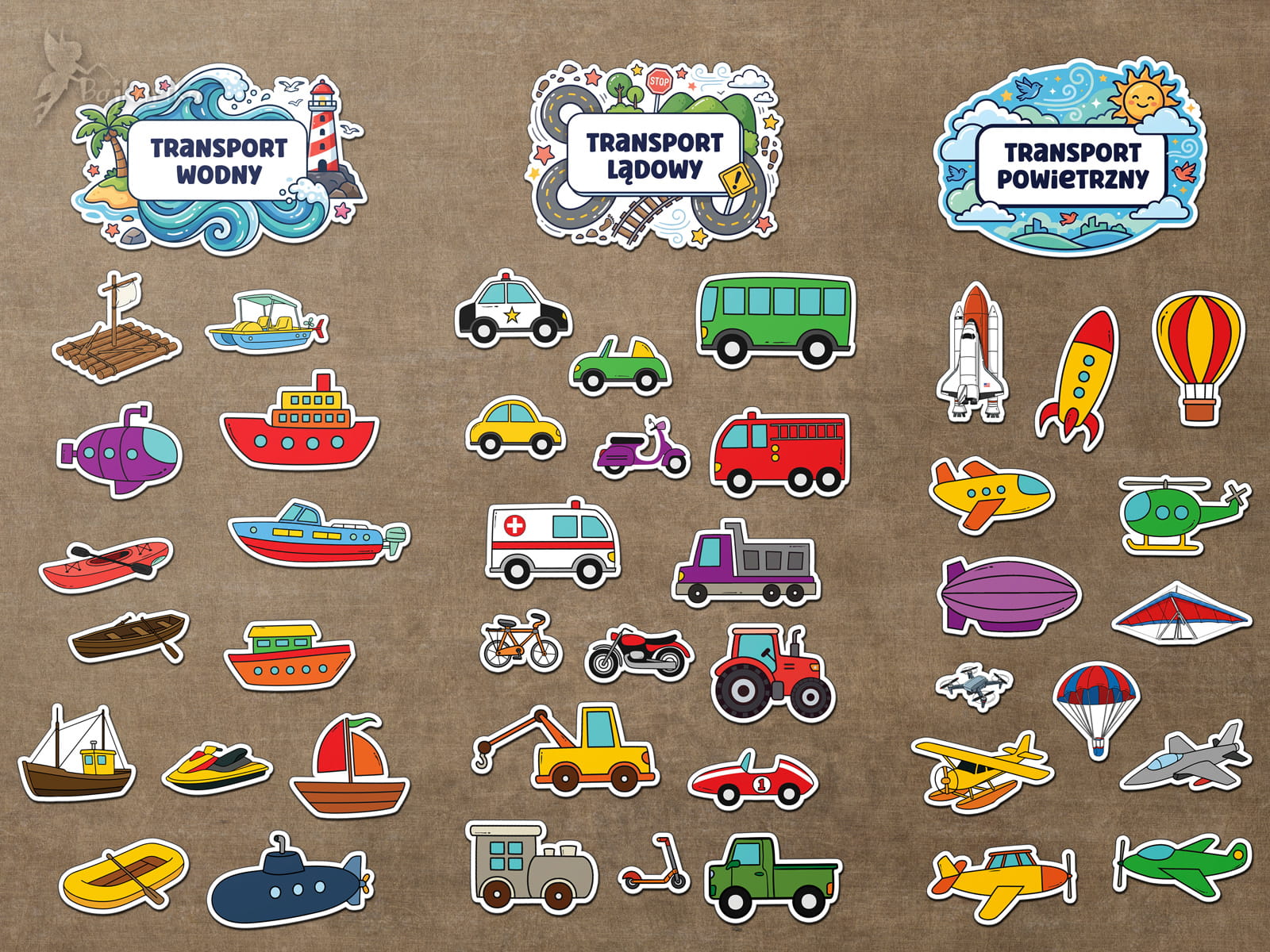 • 3 grafiki z podziałem transportu na: wodny, lądowy i powietrzny, każda grafika na jednej stronie A4;