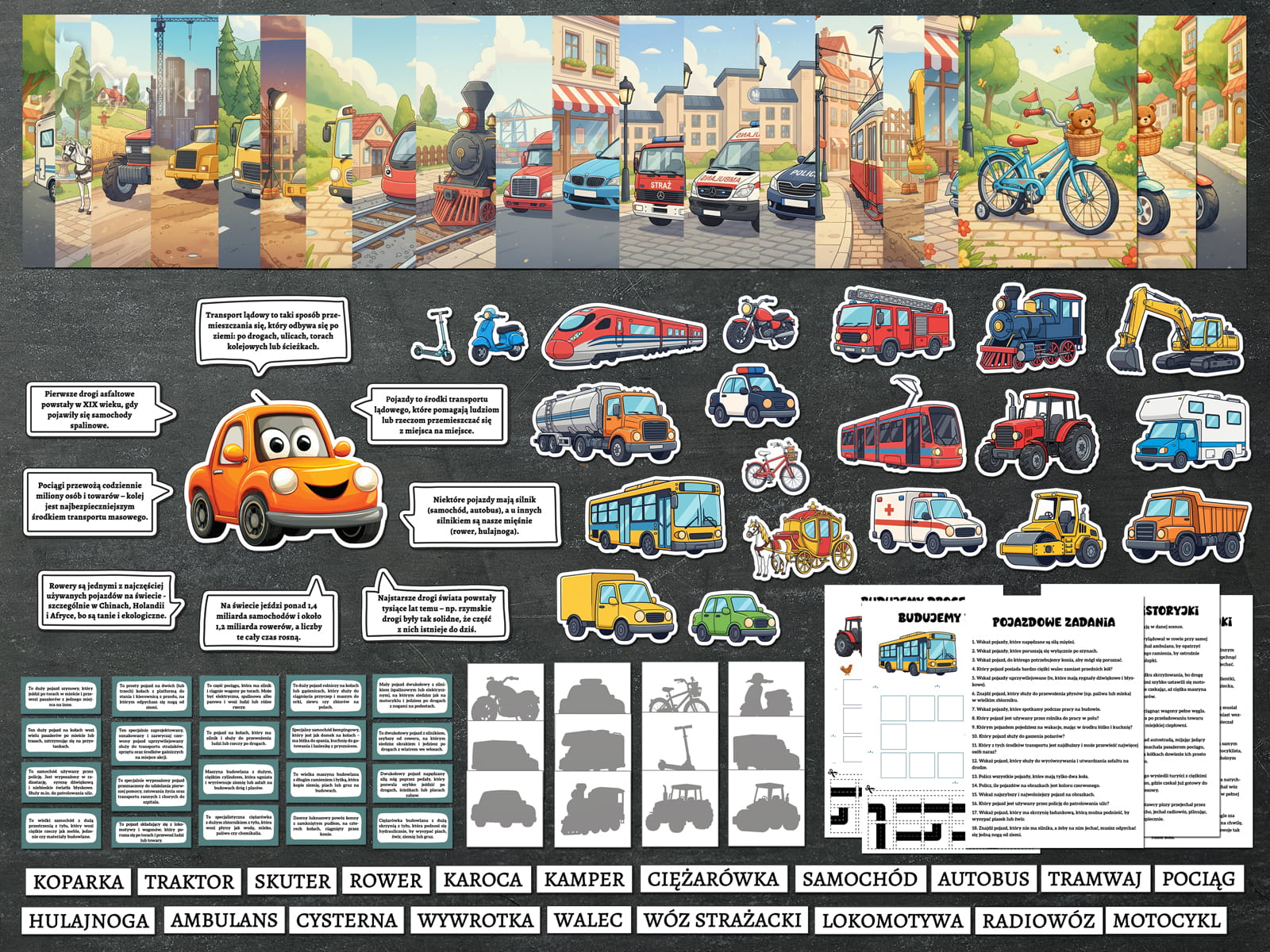 W zestawie: 20 kartoników ze środkami transportu lądowego oraz 18 zadań.
