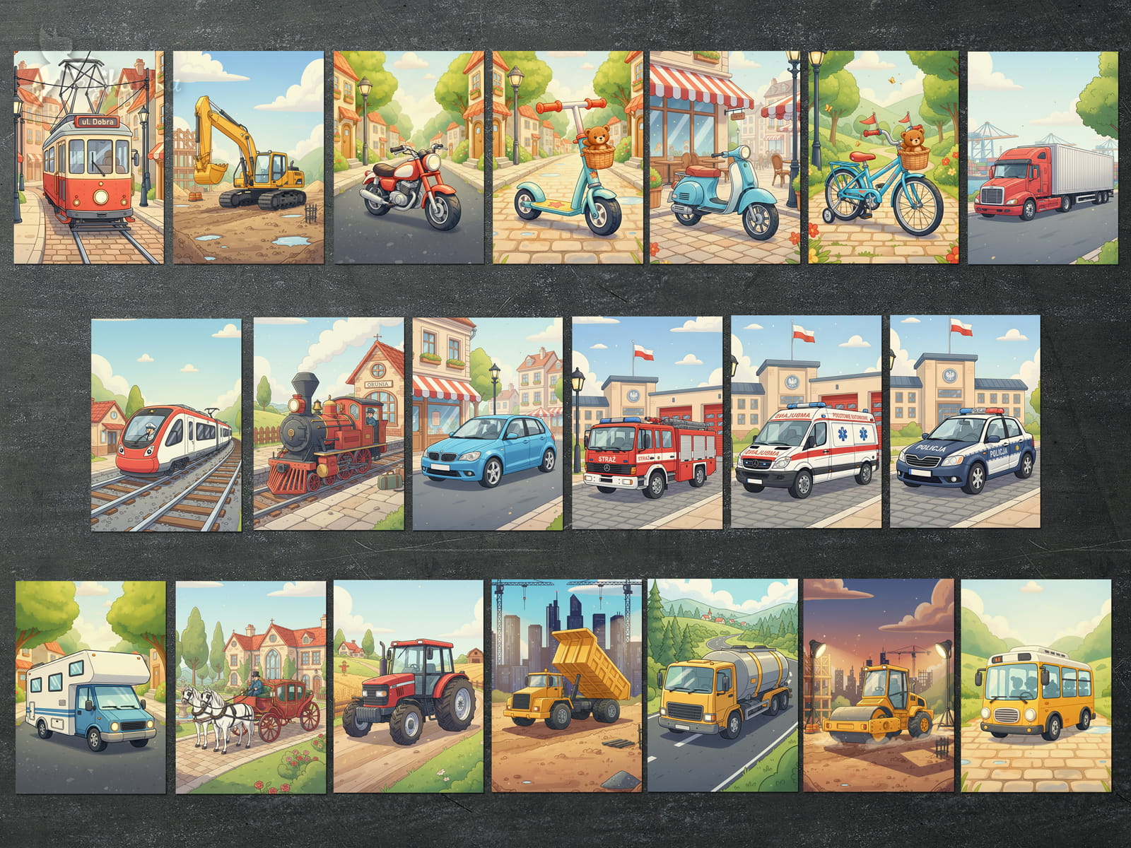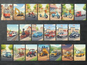 W zestawie: 20 kartoników z pojazdami, 20 kartoników z nazwami środków transportu lądowego i 20 opisów.