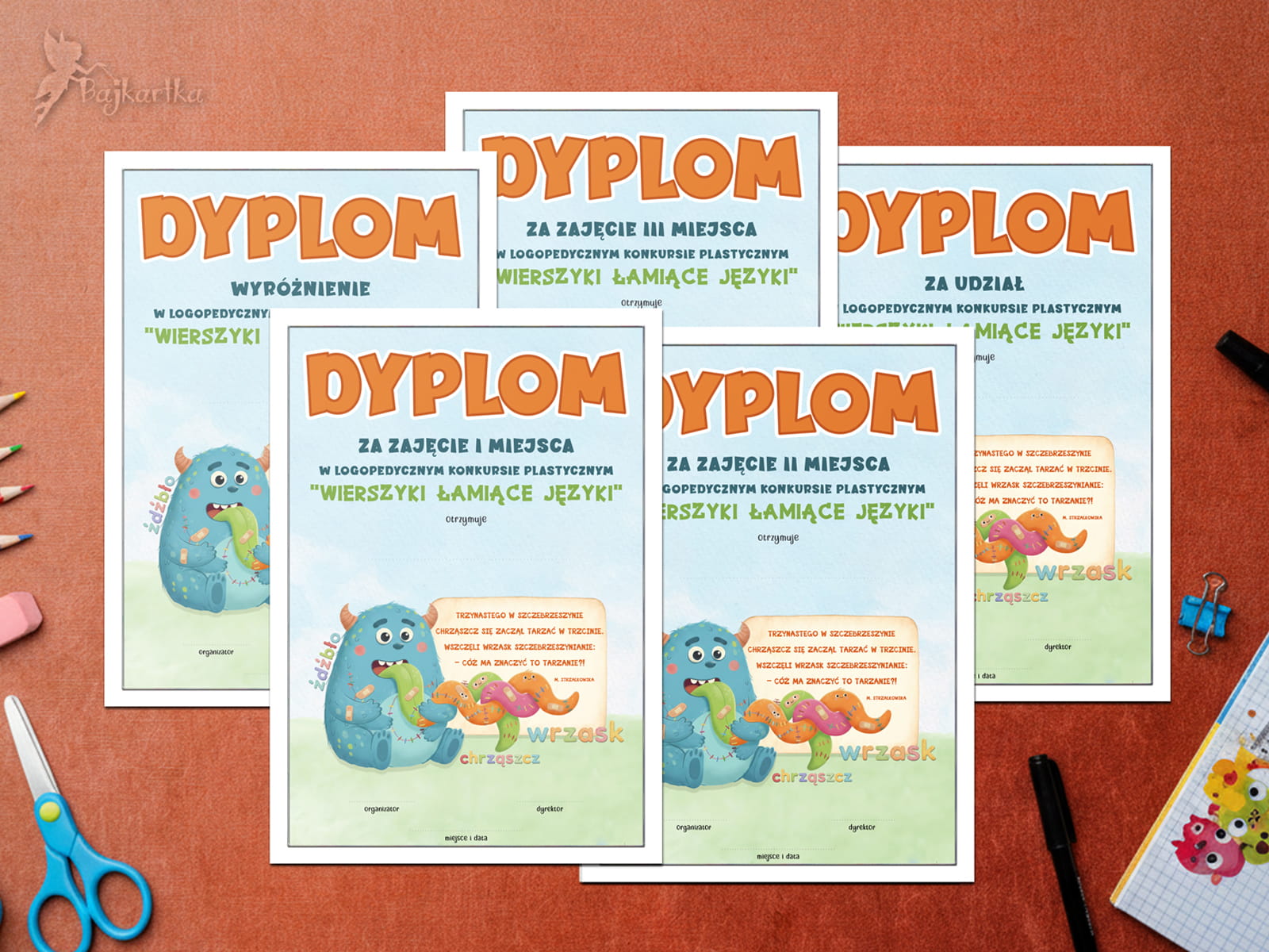 Zestaw 5 dyplomów: za zajęcie I, II, III miejsca, za udział oraz dyplom wyróżnienia w logopedycznym konkursie plastycznym „Wierszyki łamiące języki” – 5 stron A4. Każdy dyplom zawiera wykropkowane miejsce na wpisanie imienia i nazwiska i nieco niżej na podpisy organizatora oraz dyrektora, a także na wpisanie daty i miejsca konkursu.
