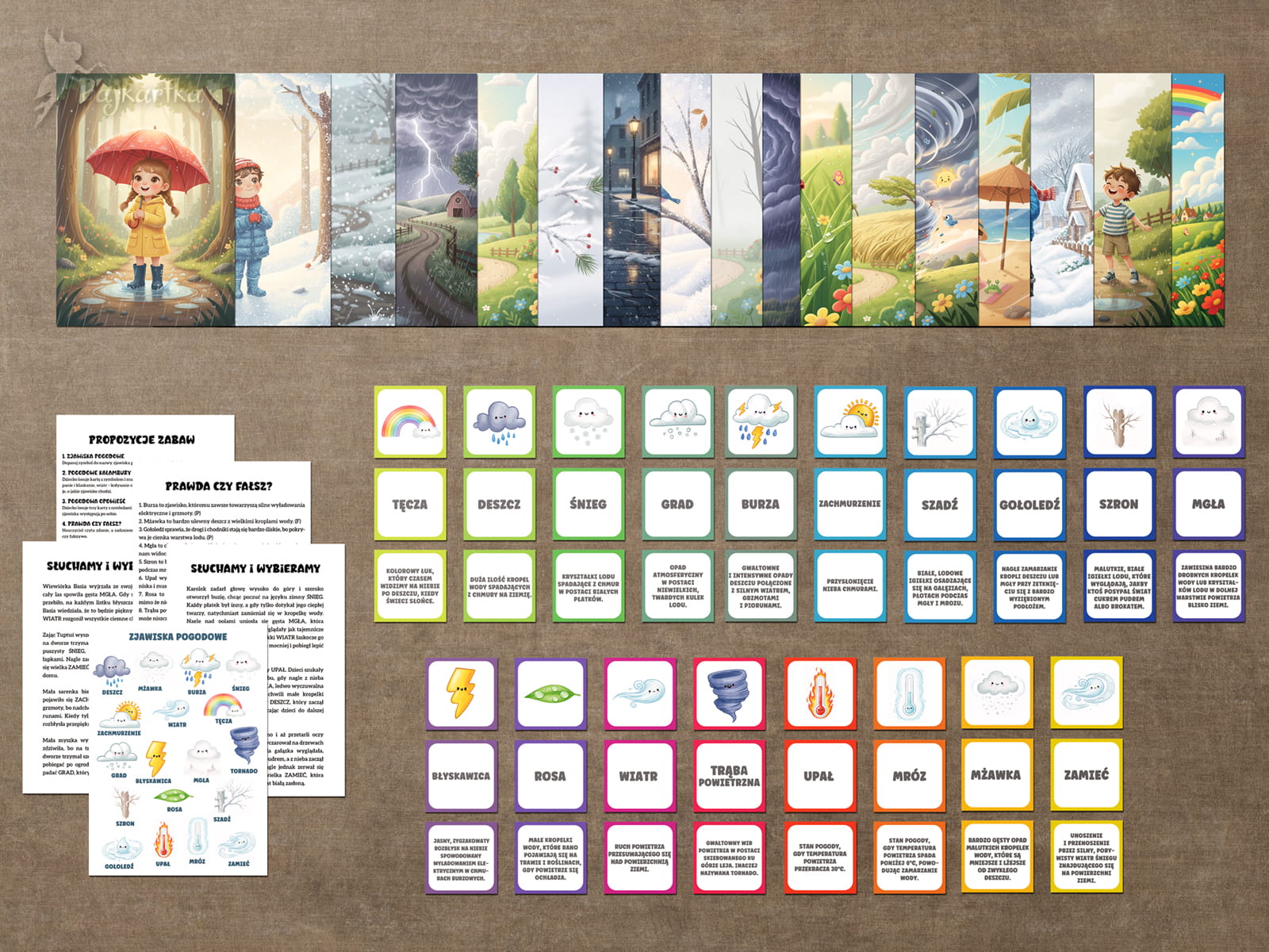 Zjawiska pogodowe – kreatywny zestaw do przedszkolnych i wczesnoszkolnych zabaw. Znajdziesz w nim 18 plansz z wybranymi zjawiskami pogodowymi (wielkości A4), planszę A4 oraz instrukcję i elementy do przeprowadzenia następujących zabaw: